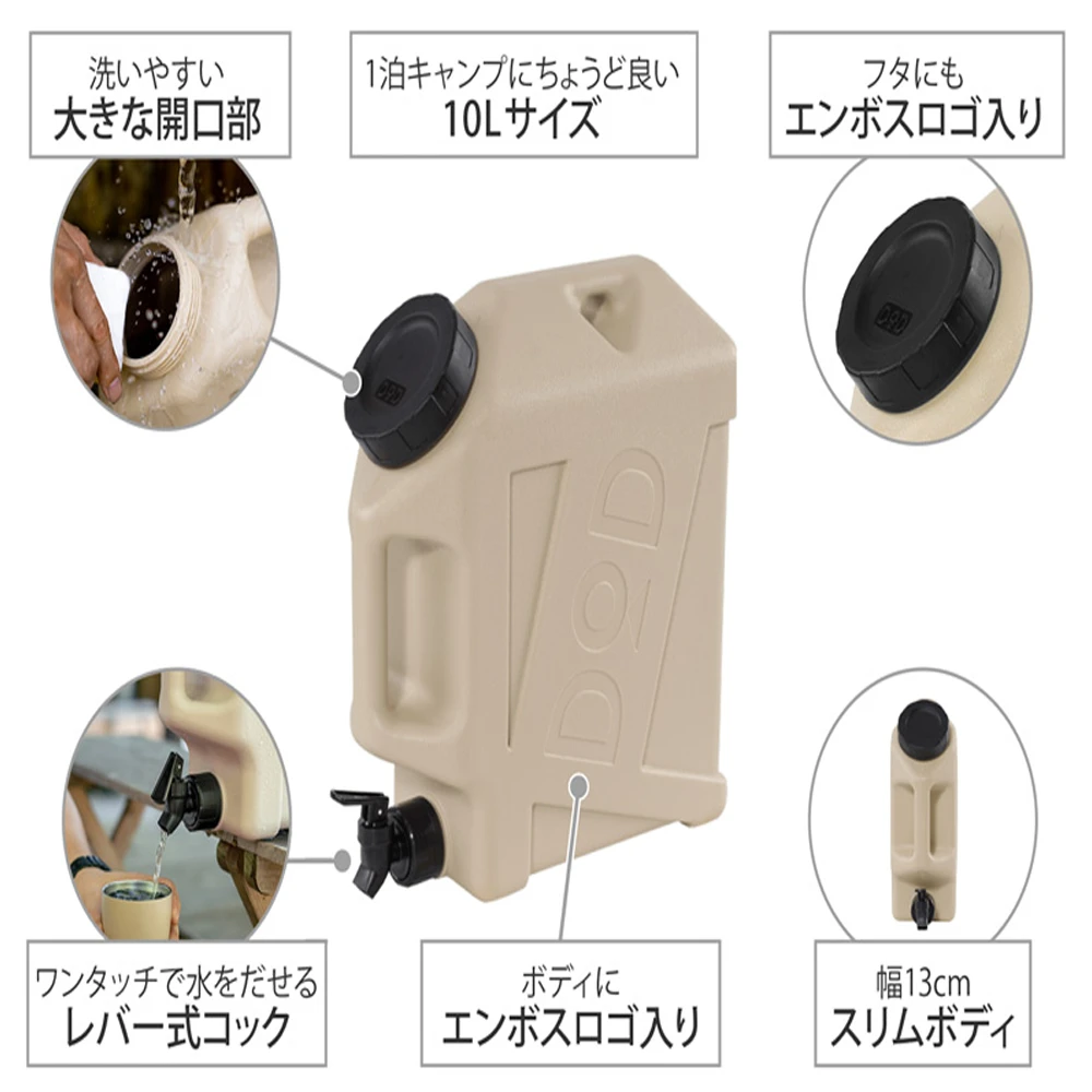 A water tank that is easy to put out, easy to wash, easy to dry, and has a small ingenuity. A 10L size water tank that can be used widely from BBQ to family camps.